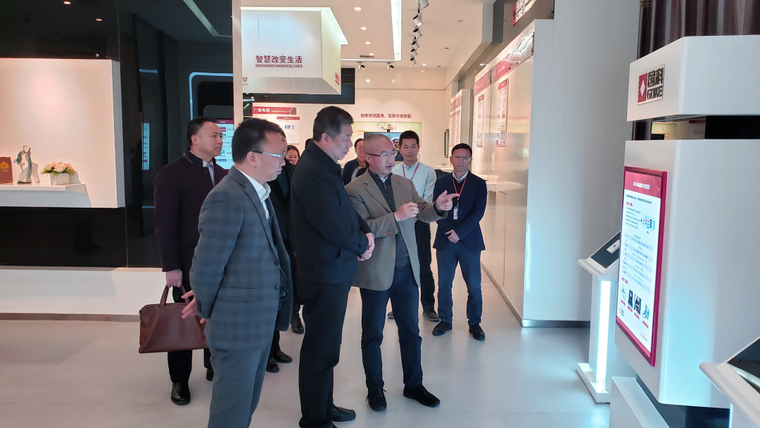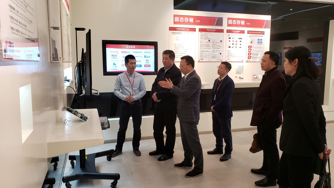 在董事長向平、COO周士兵的陪同下,童旭東一行實地參觀了國科微的展廳,對國科微在智能機頂盒、視頻編碼、存儲、物聯網等領域自主研發的主要產品一一進行了了解,并詳細咨詢了公司在研發投入、人才引進、市場開展等方面的情況。